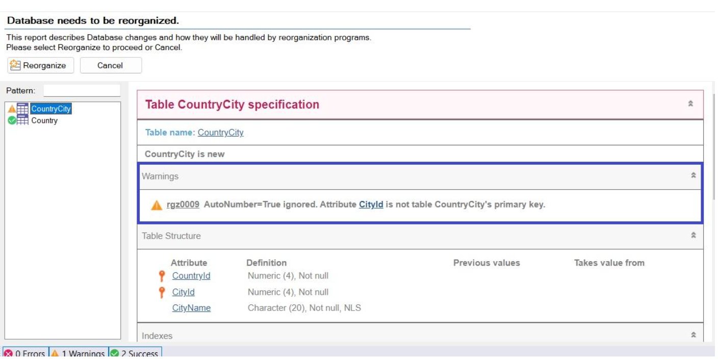 A warning is displayed in the Impact Analysis Report indicating that the value Autonumber = True will be ignored in the CityId attribute.