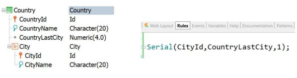 Define the Serial rule in the Country transaction, to generate the autonumbering of the CityId attribute. For this you must define an auxiliary attribute in the head to store the last assigned value: