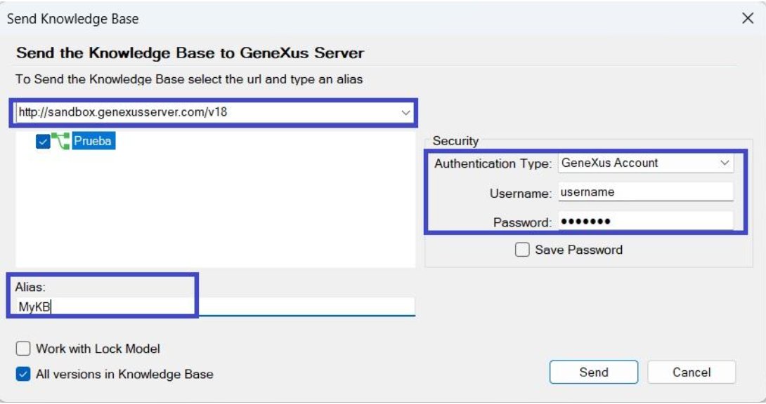 - Indicates the name with which the KB will be published on the server (Alias). It must be unique, meaning that two KBs with the same name cannot exist on the server.