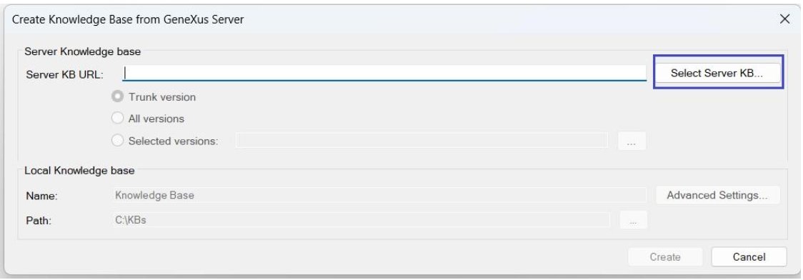 If you want to synchronize with a KB already published on the server:File / New / Knowledge Base from GeneXus Server