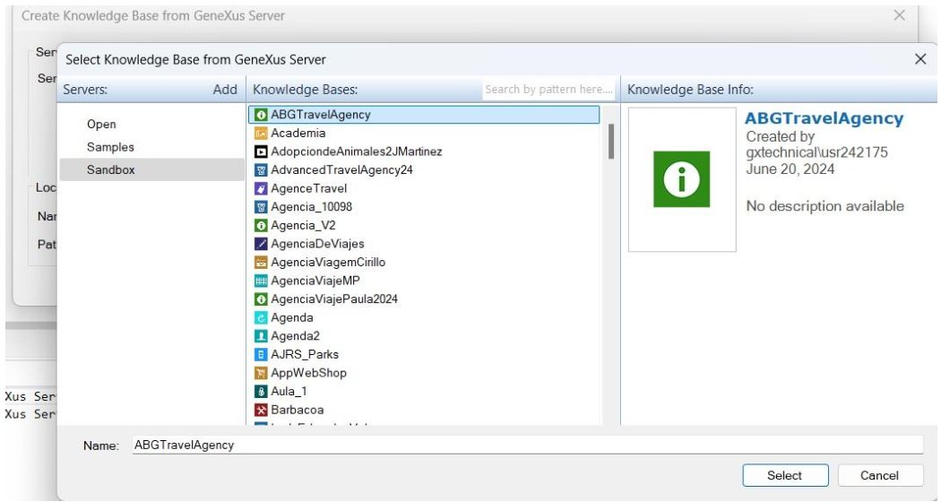 - Select the KB with which you want to establish the connection and receive a local copy. Press Select: