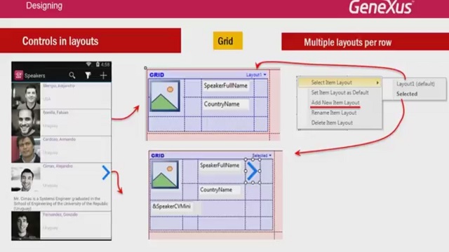 Presentation of the possibility of varying the design of each row in a grid to show, every time, a different design from several available. How to design multiple layouts, and how to select, in design time or in runtime, the layout to be loaded for each row.